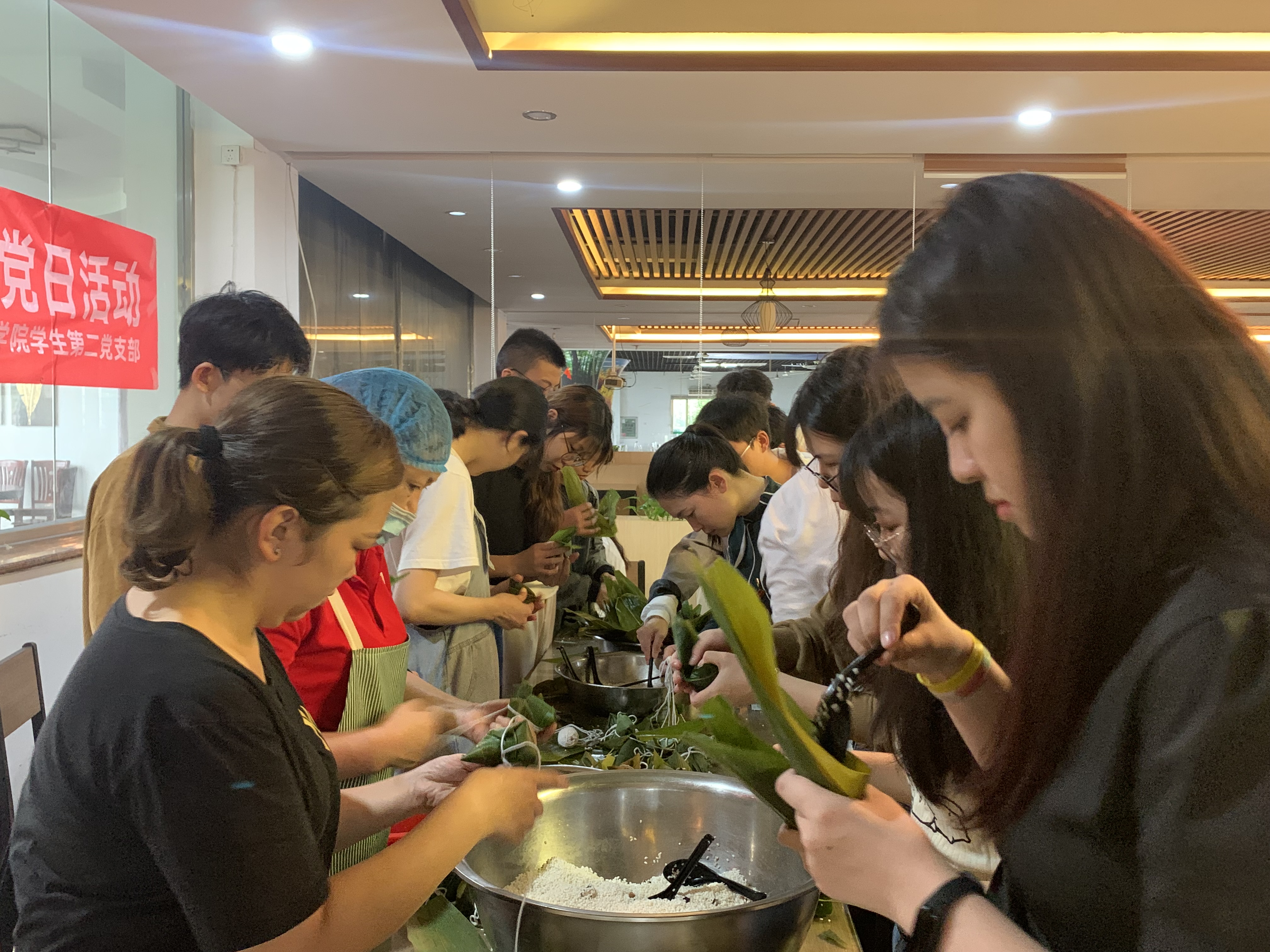 活动中,与会的学生党员、入党积极分子现场向食堂工作人员学习包粽子,并共话端午时节的家乡节俗、纪念屈原的方式,其乐融融地思念家乡,在劳动中体会“传家训、扬家风”的重要意义。师生党员们分享了毛泽东、周恩来在革命战争年代勤俭节约的党史故事,学习习近平总书记关于“党的传家宝——勤俭节约”的一系列重要论述,体会“一粥一饭当思来之不易,半丝半缕恒念物力维艰”的至理名言,感恩新时代来之不易的美好生活,共同坚定永远跟党走的信念。
