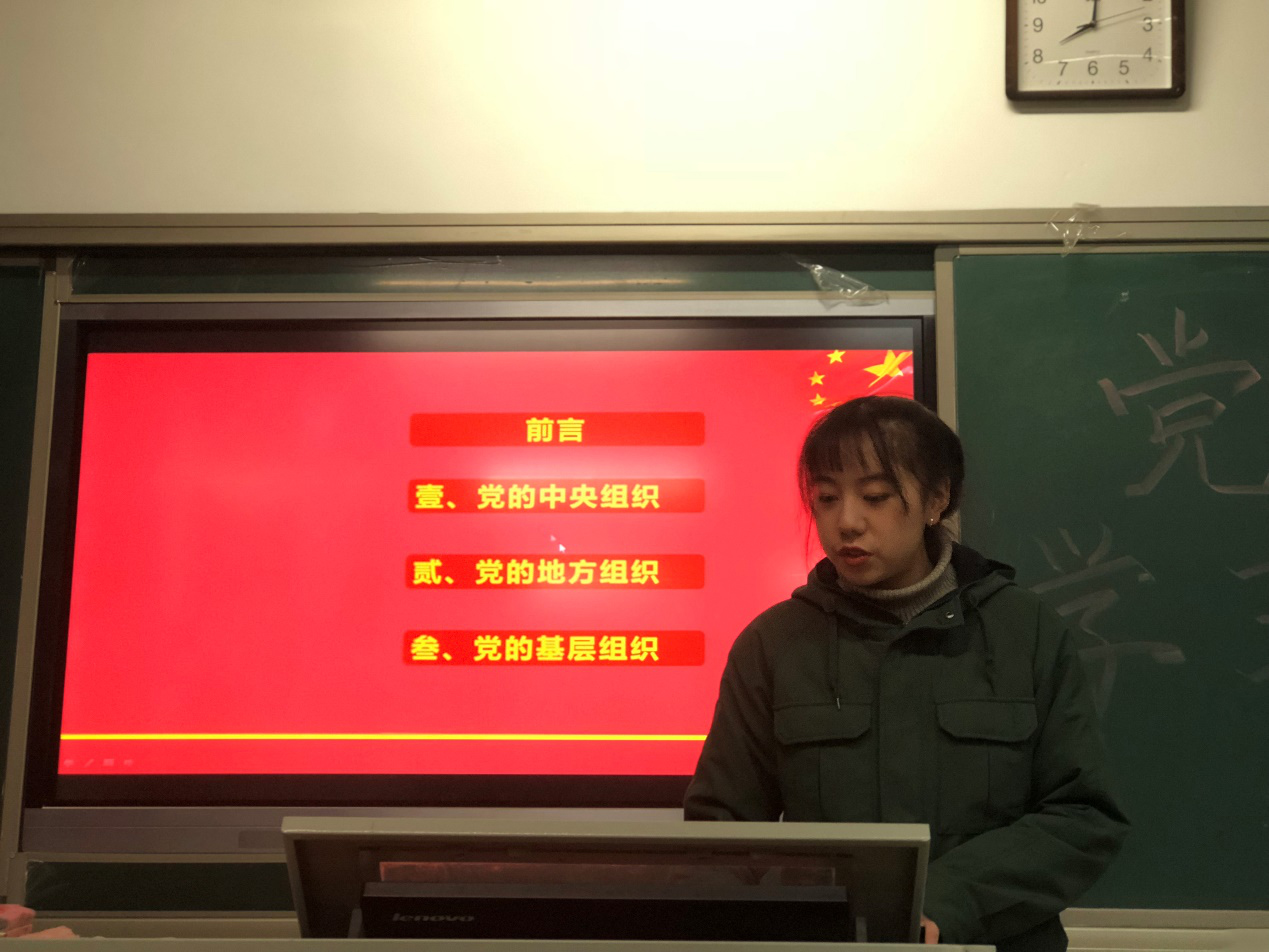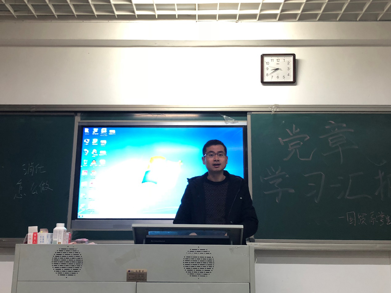 为深入学习中国共产党章程,将党章“内化于心,外化于行”,把握正确的政治方向,加强党性修养,提升对党的认知,1月3日晚七点国际经济与贸易系学生党支部副书记蔡斌于笃行101开展学习新党章汇报活动我系18名本科班积极分子参与此次活动