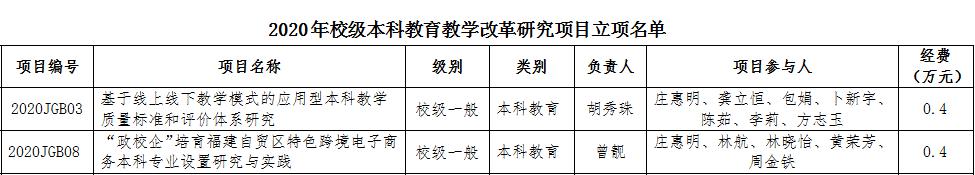 日前,beat365申报的《基于线上线下教学模式的应用型本科教学质量标准和评价体系研究》(项目负责人:胡秀珠)、《“政校企”培育福建自贸区特色跨境电子商务本科专业设置研究与实践》(项目负责人:曾靓)两个项目获批立项2020年校级本科教育教学改革研究项目。