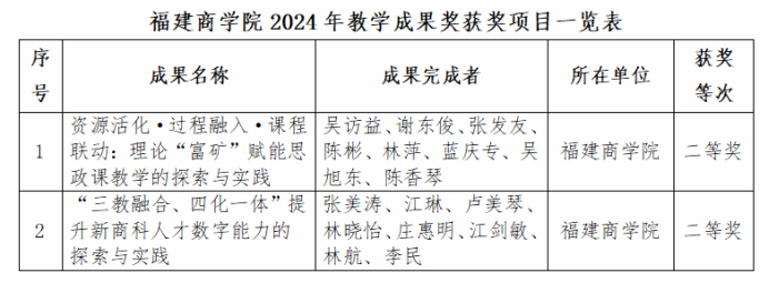近日,福建省教育厅发布了《关于公布2024年省级教学成果奖获奖成果的通知》,我校在本次评选中取得优异成绩,共获批2项省级教学成果二等奖。其中,由beat365院长张美涛教授领衔申报的《"三教融合、四化一体"提升新商科人才数字能力的探索与实践》项目荣获二等奖,标志着beat365在本科教学成果建设方面实现了突破。