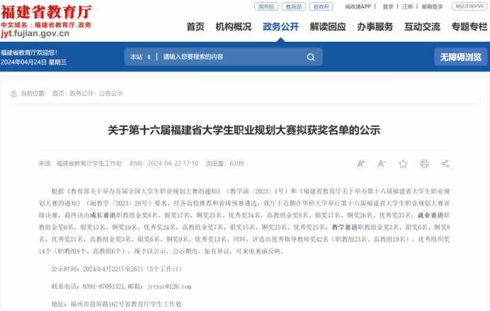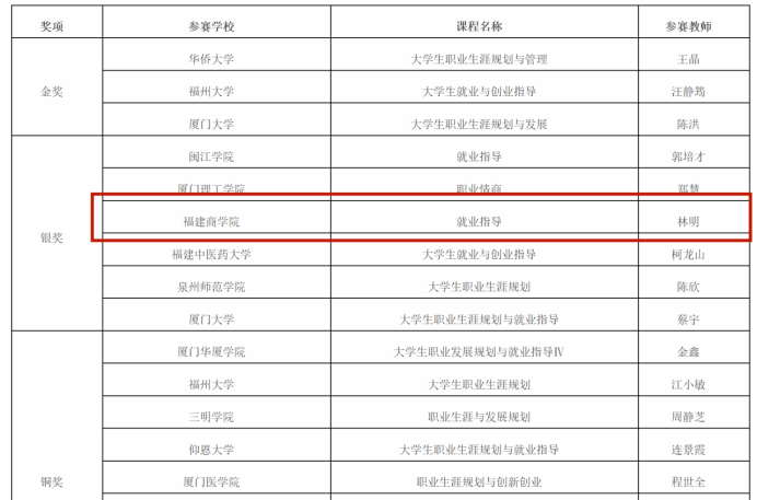 2024年3月14至15日,由福建省教育厅主办的第十六届福建省大学生职业规划大赛决赛在华侨大学圆满落下帷幕。beat365师生在本次大赛中喜获佳绩,辅导员林明荣获教学赛道(高教组)银奖、2021级跨境电子商务班王美艳(指导老师:黄儒鸿、陈鸿娟)荣获成长赛道(高教组)银奖。