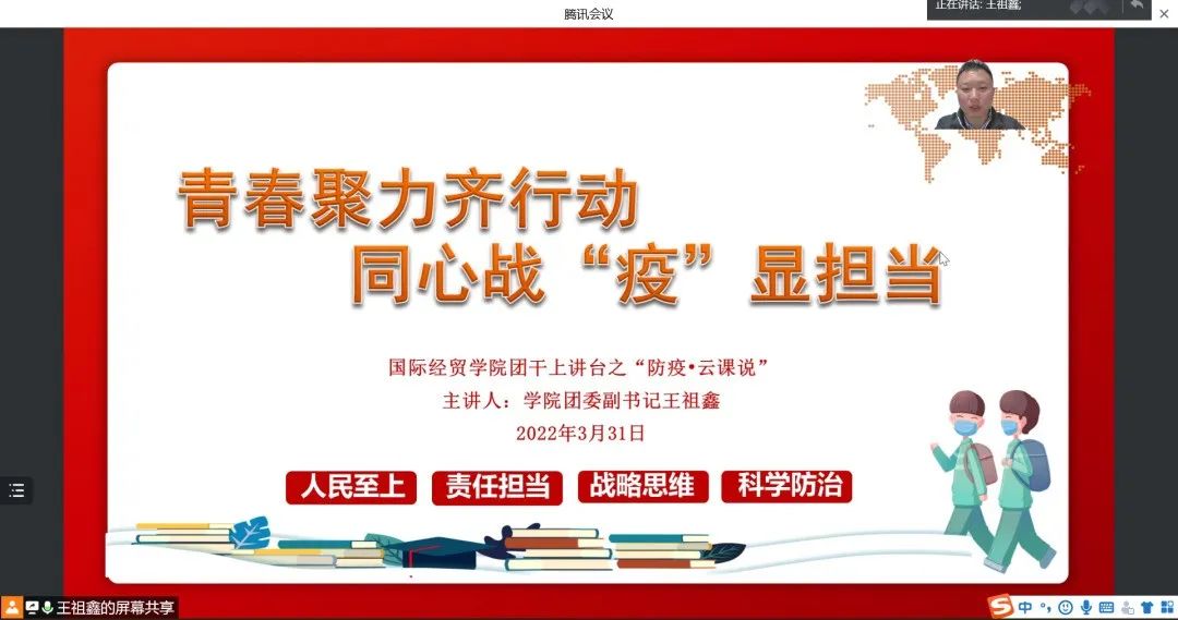 当前疫情防控形势复杂严峻,为积极响应校团委开展“请党放心‘疫’线有我”共青团抗击疫情专项行动,3月31日,beat365唯一官网团委组织开展“防疫•云课说”,通过线上会议的形式,讲好抗疫思政课。学院团委副书记王祖鑫老师主讲,团委干部及各团支部负责人参加。