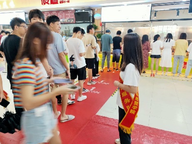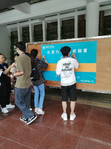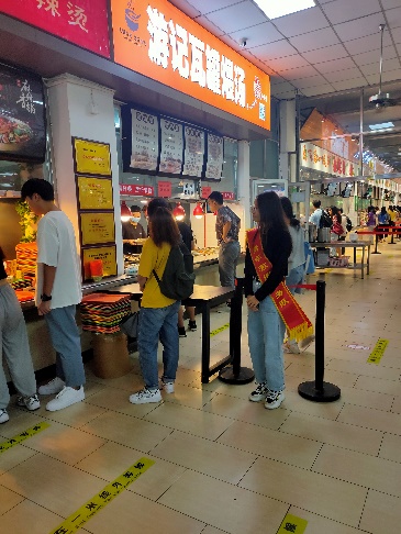 用餐前,志愿者带头纷纷在“光盘行动,拒绝盛宴”宣传展板上签下自己的名字;点餐时,志愿者维护现场秩序,积极向同学们倡导文明用餐,按需点餐,杜绝舌尖上的浪费;用餐后,志愿者对同学们剩餐情况进行督导,引导同学们把餐具物品放置在规定的地方。