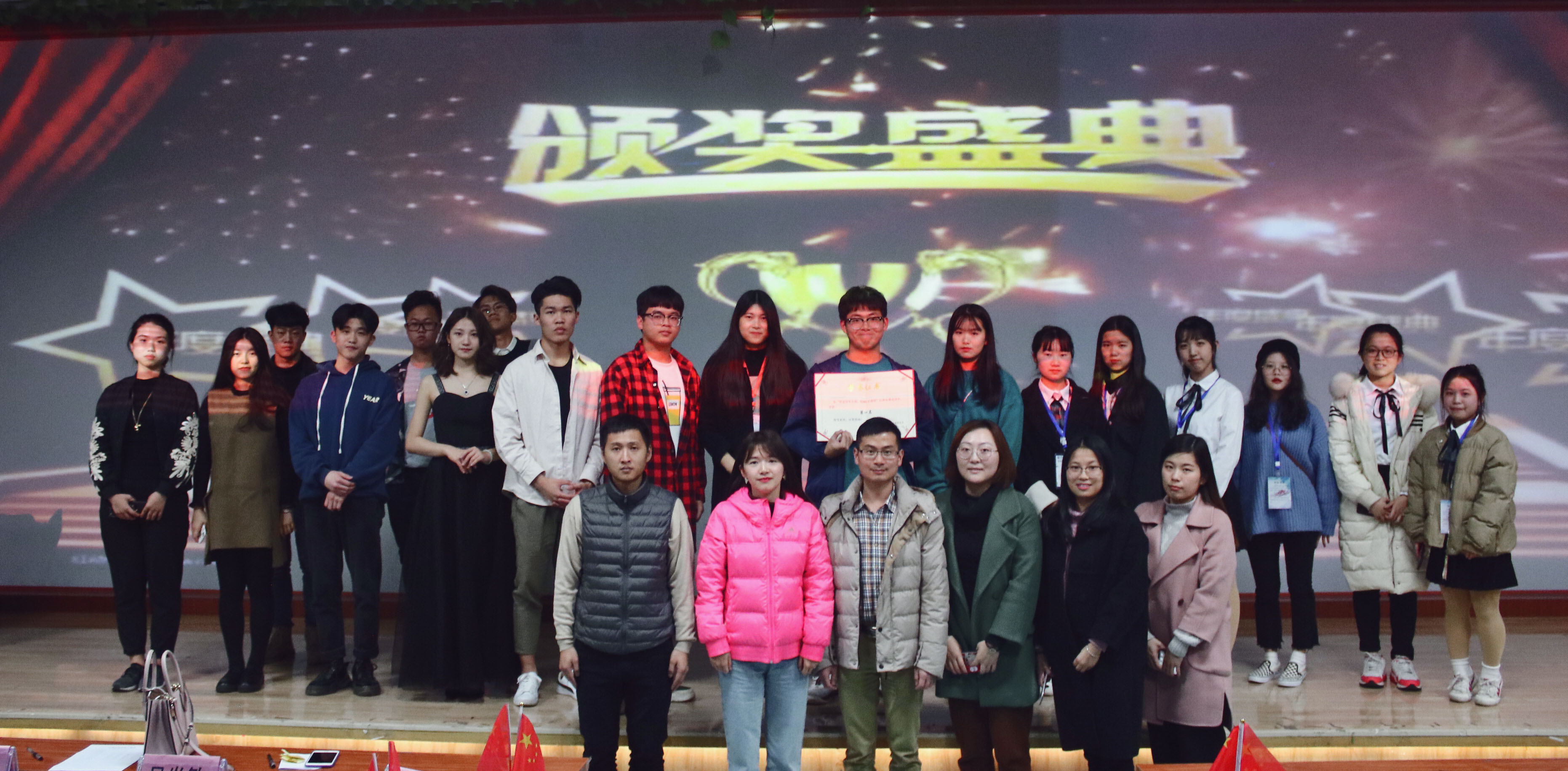 在大学生艺术团精彩的模特秀后,由林超老师讲话,蔡斌老师和关茔老师分别给获奖班级颁发奖状并全体合影留念。此次的红歌比赛意义在于对新生进行爱国主义、集体主义和民族精神的生动教育,让学生能够在校园中真切感受到党的关怀,抒发对祖国的热爱,激发大家健康向上,热爱生活,继承和发扬党的光荣传统,同时也促进同学们团队合作的精神。
