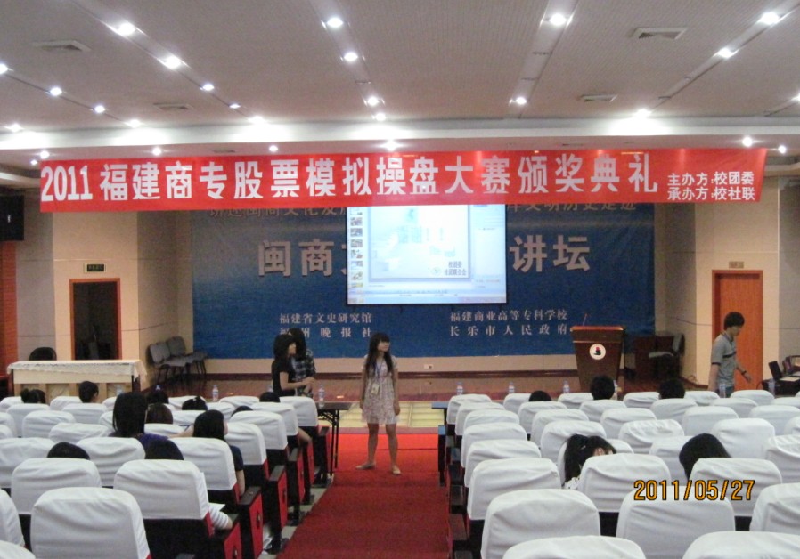 2011年5月27日13:00,福建商专2011年首届股票模拟操盘大赛颁奖典礼在我校演播厅隆重举行。这场典礼是一场金融风云的终结点,是我校商场新才的成长见证,更是我们经济贸易系绝佳风采的展现。应邀本次典礼的嘉宾有经济贸易系团总支书记陈煌勇老师、外语系团总支书记叶坦老师、校团委学生会团副蔡伟、各系团委学生会团副主席以及国泰君安证券有限公司代表朱先生、金友期货公司代表曹女士。
