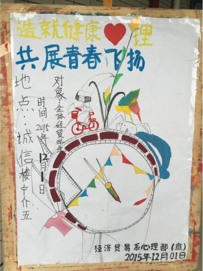 为了丰富校园文化生活,引发同学们对自身心理健康的关注,2015年12月1日下午2:30,经济贸易系之“造就健康心理,共展青春飞扬”心理微电影大赛于校活动中心顺利举行。该比赛由经贸系团总支学生会心理部主办,经贸系各专业的学生代表均出席了本次比赛。