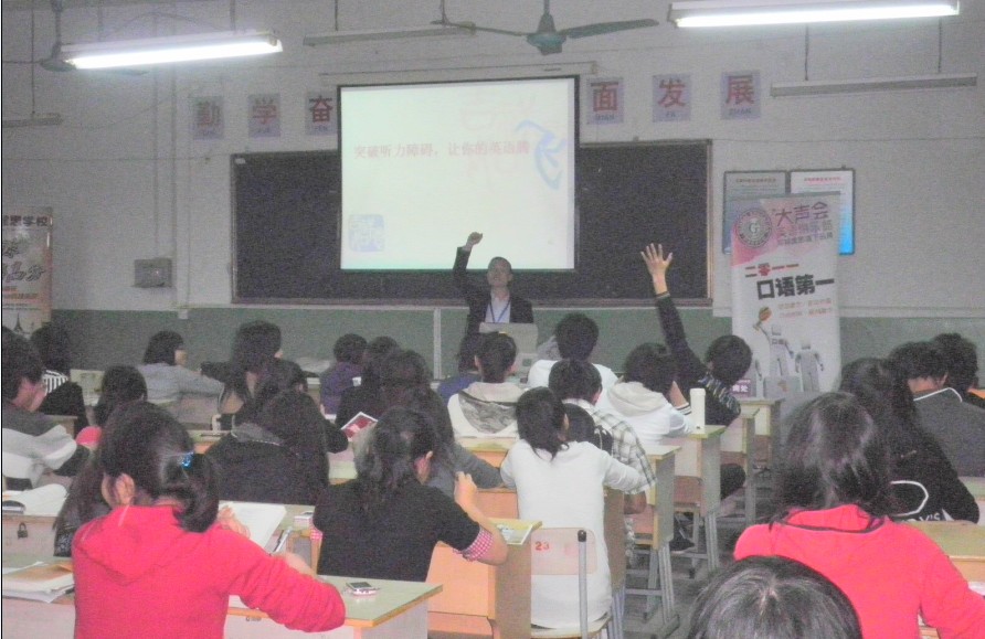 老师更是以滑稽的图片,经典的英文歌曲和精彩的影片剧段吸引了场上所有同学的眼球。他对听力的独特见解以及提高方法都为同学们即将到来的英语四、六级听力考试点亮了一盏明灯。同学们的热烈掌声喻示了此次讲座的成功。