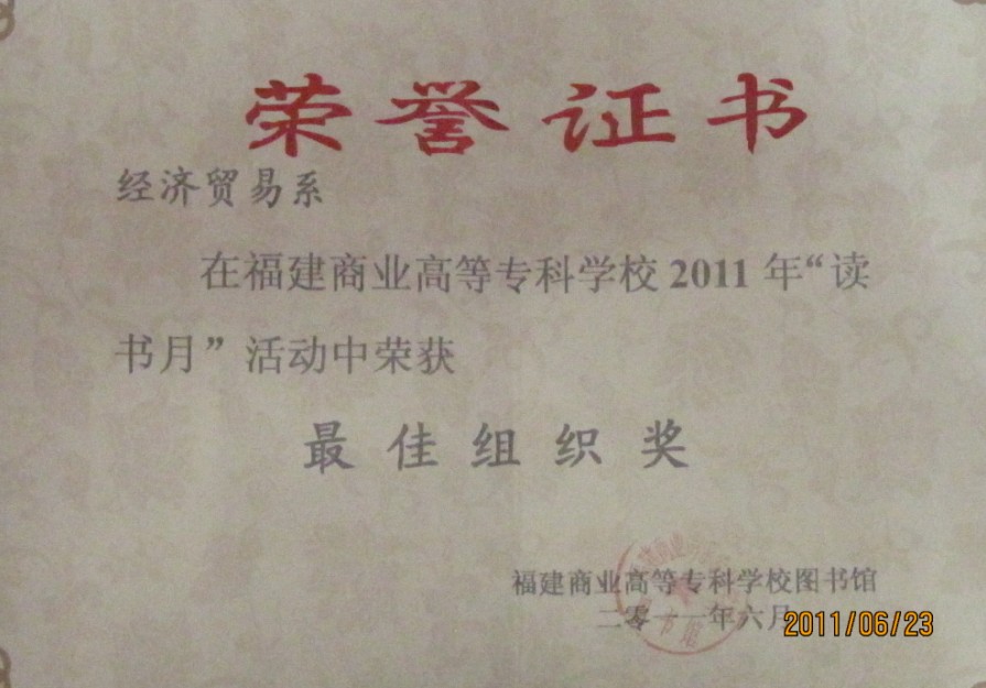 为帮助学生养成良好的阅读与学习习惯,多读书,读好书,提高读写能力,我系积极配合此次校图书馆举办的“青春作伴好读书”主题征文活动。在该活动中,我系学生的积极参与,以及系领导的鼎力支持,此次活动在我系得到全面倡导与开展,并且成绩显著。2011年6月,我系荣获福建商业高等专科学校2011年“读书月”活动“最佳组织奖”,同时,我系学生陈小倩同学与吴清凤同学荣获福建商专2011年“读书月”活动征文比赛三等奖。