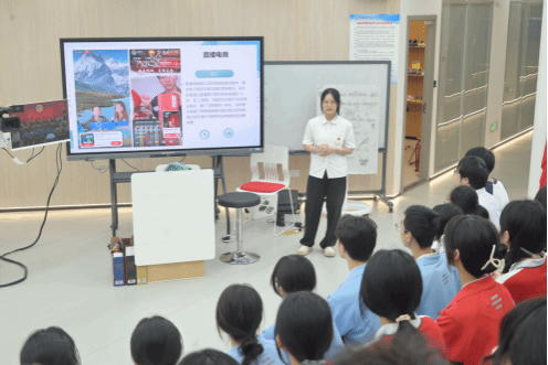 首先,2022级电子商务专业的叶佳莉同学化身“小老师”,以“直播带货助脱贫”的真实案例视频为引,带大家深入了解直播行业背后的社会价值与经济动能。她从直播室搭建的基础要素讲起,通过展示beat365学生在直播实践中的精彩视频,生动呈现了电商直播的全流程运作。这堂兼具理论深度与实践温度的认知课,不仅为中学生们揭开了电商直播的神秘面纱,更在他们心中播撒下了创新商业思维的种子。