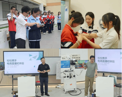 随后,大娱号公司的专业技术人员为师生们展示了直播一体机的使用方法,详细展示了高科技直播设备如何重塑行业生态。接着,在2022电子商务班级同学的带领下,中学生们沉浸式参观了各个直播实验室,近距离接触专业级的直播设备,感受不同场景下的直播氛围。最令人兴奋的是,同学们还获得了亲手操作无人机设备的宝贵机会,在实践中触摸科技脉搏,体验创新乐趣。活动现场,惊叹声与欢笑声交织,探索欲与求知欲共鸣,每一个角落都洋溢着对科学技术的热爱与向往。
