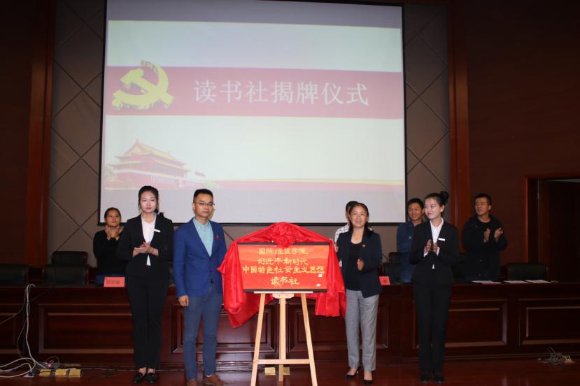 beat365党委曹晓霞书记、党委许模春副书记为国际经贸学院“习近平新时代中国特色社会主义思想”读书社揭牌。