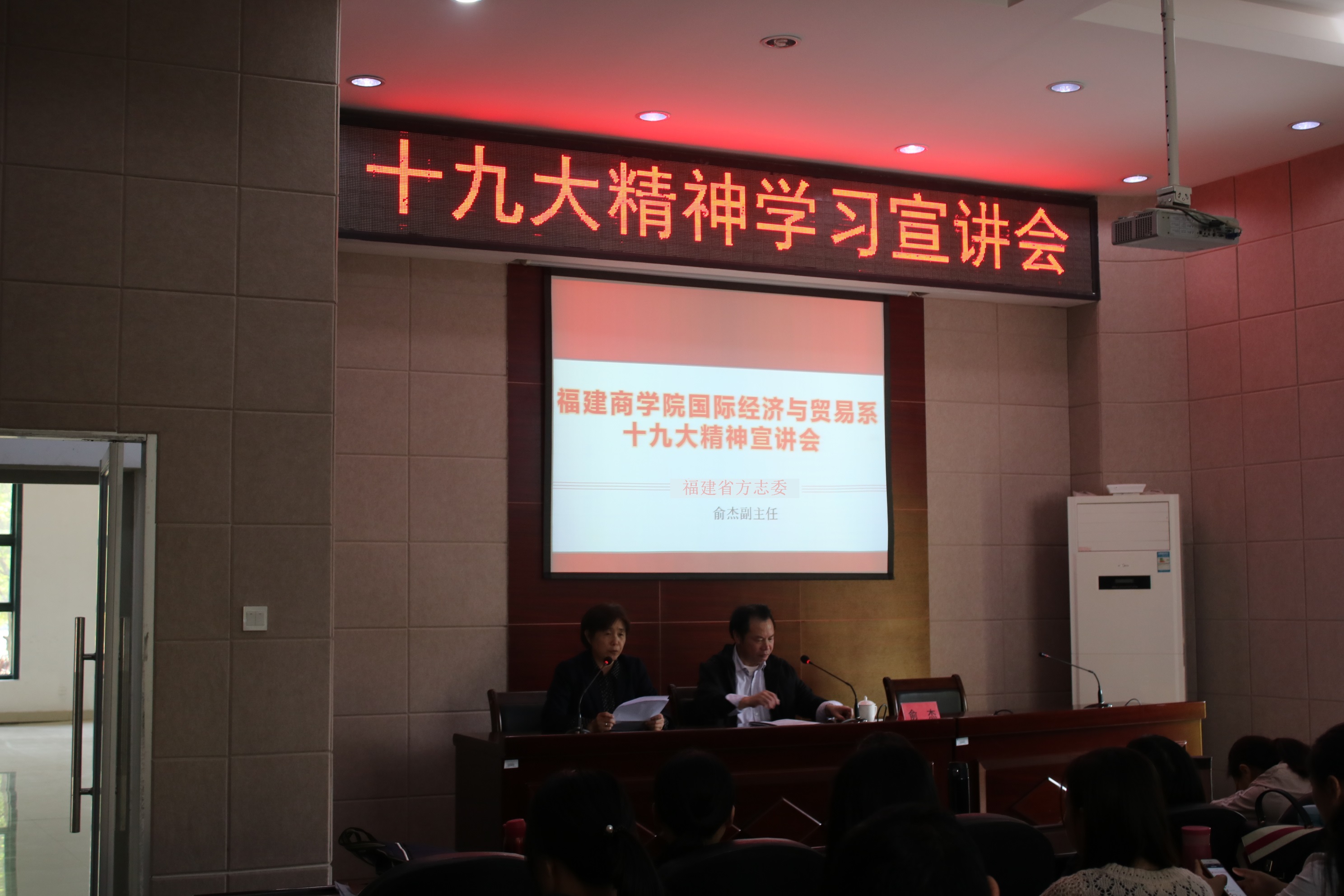 为学习贯彻党的十九大精神,传承发扬中华民族优秀传统文化,培育弘扬社会主义核心价值观,践行福建精神,坚定文化自信。4月10日下午,国际经济与贸易系特邀福建省方志委副主任俞杰来我系开展十九大精神专题宣讲。讲座由我系党总支负责人曹晓霞主持,国贸系全体师生党员、马尾校区各班团支部书记和党建、两委学生干部参加。
