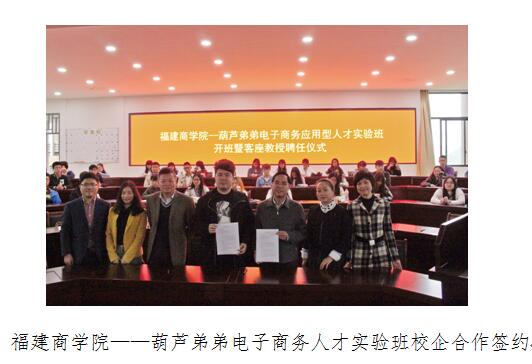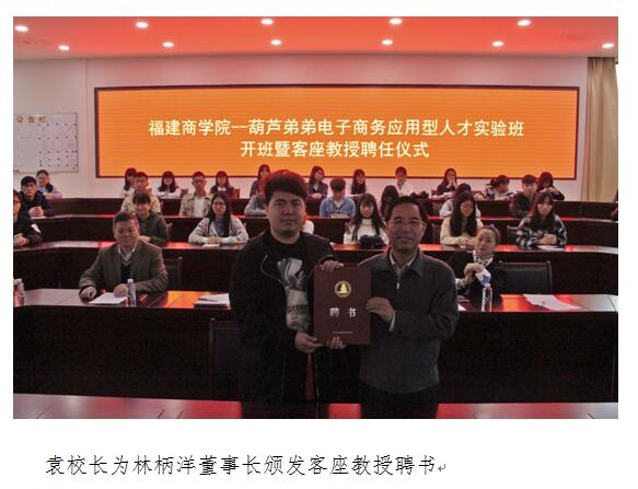 4月13日上午,福建商学院——葫芦弟弟电子商务应用型人才实验班开班暨客座教授聘任仪式在连江校区举行,福建商学院筹建工作领导小组副组长、福建商业高等专科学校校长袁新文和福州葫芦弟弟电子商务有限公司董事长林柄洋共同签署校企合作协议,并颁发客座教授聘书。教务处、实训处负责人和经贸系16级本科全体师生参加了仪式。