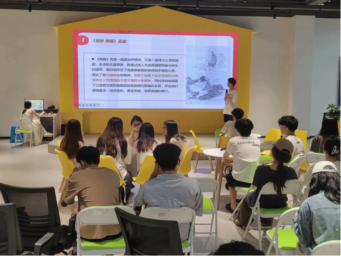 学习会围绕伟大爱国诗人屈原的作品展开。领学人张博宇带领支部成员回顾了屈原的生平和代表作品,深切感受屈原的爱国主义情怀。陈欣欣同学代表发言,她表示屈原的爱国情怀与当今社会的国家意识高度契合,当代大学生要树立矢志不渝的共产主义理想信念,培育荣辱分明的道德情操,增强我们的国家认同感和归属感。